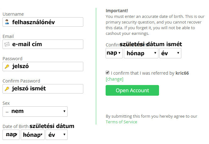Mint minden oldalon, itt is első dolgunk regisztrálni. Ehhez a következaő űrlapot kell kitöltenünk: